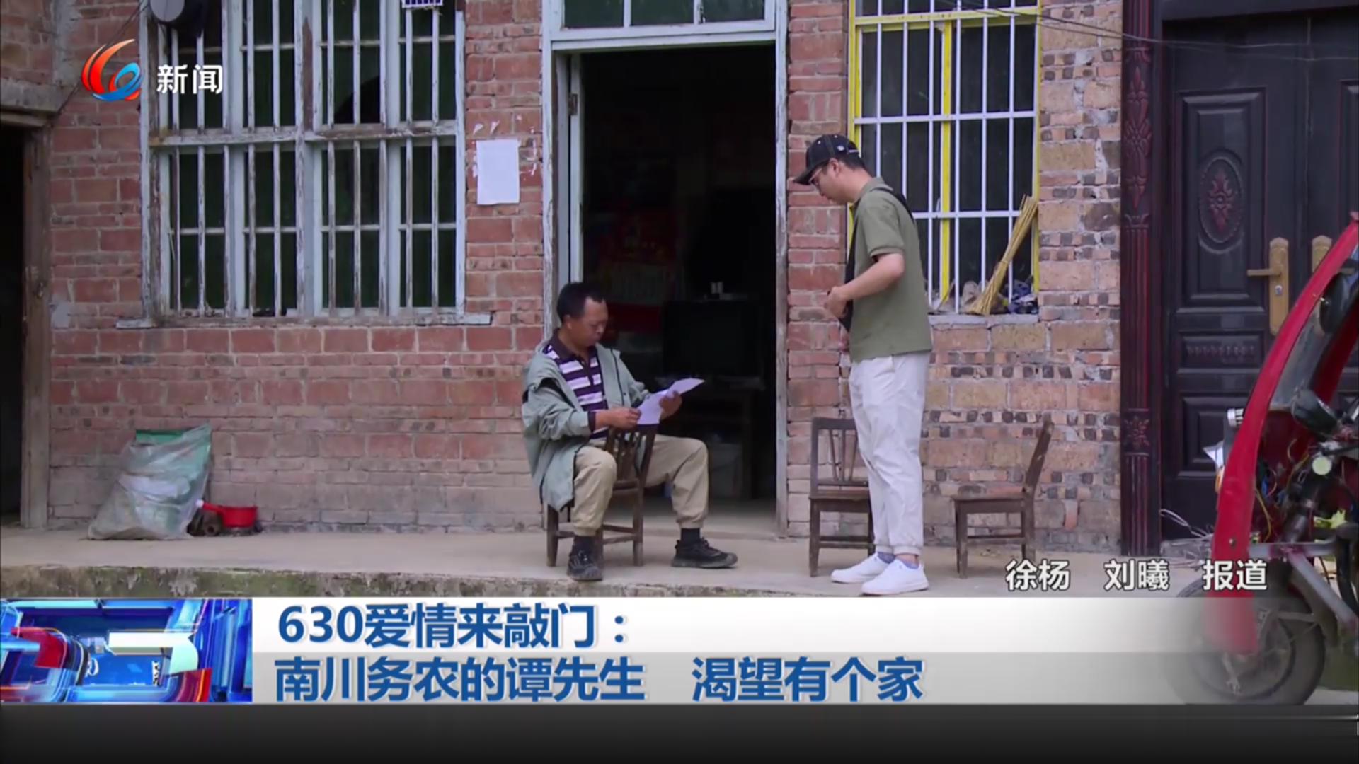 天天630,爱情来敲门;记者当红娘,先生女士都漂亮。今天的征婚嘉宾,是47岁的谭兴文,他家住南川,务农,因为经济条件不好,一直没有成家,希望我们去帮他一把。