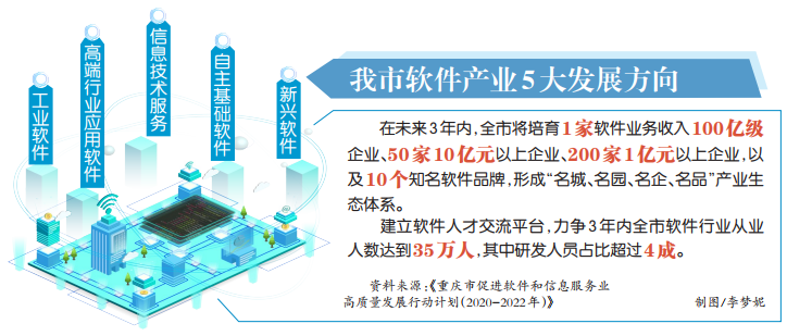 市政府办公厅日前发布《重庆市促进软件和信息服务业高质量发展行动计划(2020-2022年)》(以下称《计划》)提出,到2022年成功创建“中国软件名城”,培育2个中国软件名园、1个国家数字服务出口基地,全市软件业务年收入达3000亿元,年均增长超过20%。