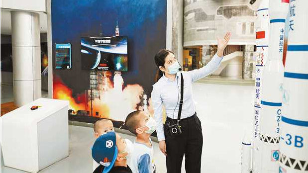 “小朋友们,这是我们的‘火箭家族’展品。目前正在太空‘出差’的3名航天员,就是被其中一枚火箭送上太空的,你们知道是哪一枚吗?”