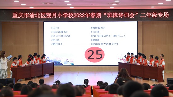 3月25日下午,重庆市渝北区观月小学校在报告厅内开展了二年级诗词大会。活动开始前,观月小学二年级的同学们以班级为单位,举着班牌有序入场,每个孩子都十分激动,热烈地讨论着接下来的活动。
