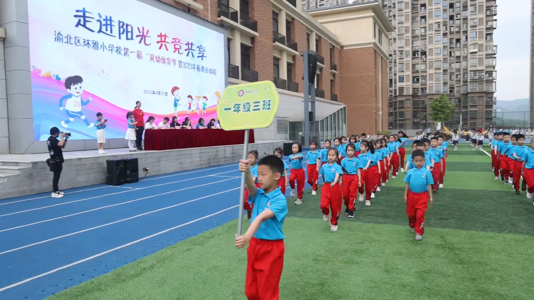 近日,伴随着初夏的气息,迈着坚实的步伐,渝北区环雅小学校开展了以“走进阳光 共竞共享”为主题的第一届“灵动体育节”暨2022年春季运动会。在激昂的音乐声中,开幕式正式开始。