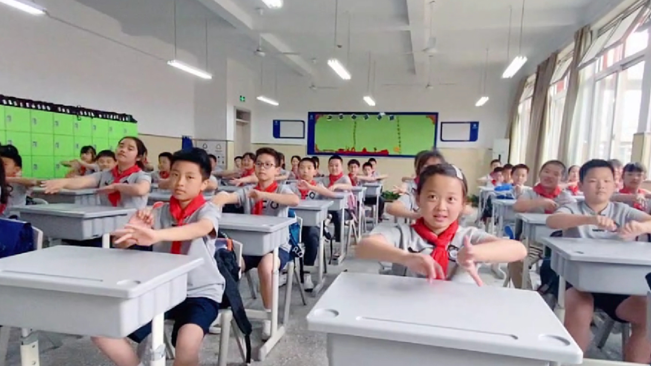 近期,重庆两江新区金州小学校以《站在草原望北京》作为背景音乐,为孩子们编排了一段充满活力的“韵律操”,金州小学五年级七个班的同学们在戏剧老师的带领下进行课前律动,让课堂“活”了起来。