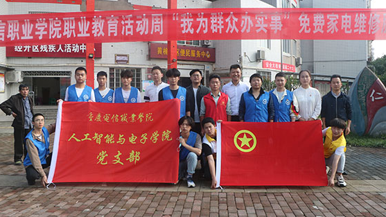近日,在重庆电信职业学院人工智能与电子学院党员老师带领下,由党员、预备党员、入党积极分子、共青团员组成的学生志愿者服务队前往重庆市大足区双路街道黄桷社区开展了“我为群众办实事”义务家电维修活动,党员教师和学生志愿者一起参与,免费为双路街道辖区内的群众维修各类家电,为群众提供优质、便利的志愿服务。