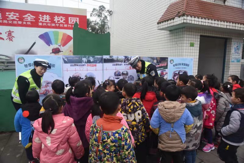 为进一步提高辖区中小学生、幼儿的交通安全意识、守法意识、自我防范意识,1月8日-14日,梁平区公安局交巡警支队在寒假前夕组织民警深入辖区紫竹小学、明达小学、袁驿中学等当地30余所中小学、幼儿园开展寒假前交通安全“进校园”宣传活动。