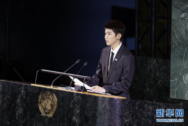 11月20日,在位于纽约的联合国总部,联合国儿童基金会大使、中国青年歌手王源在联合国大会为纪念《儿童权利公约》通过30周年举行的高级别会议上发言。