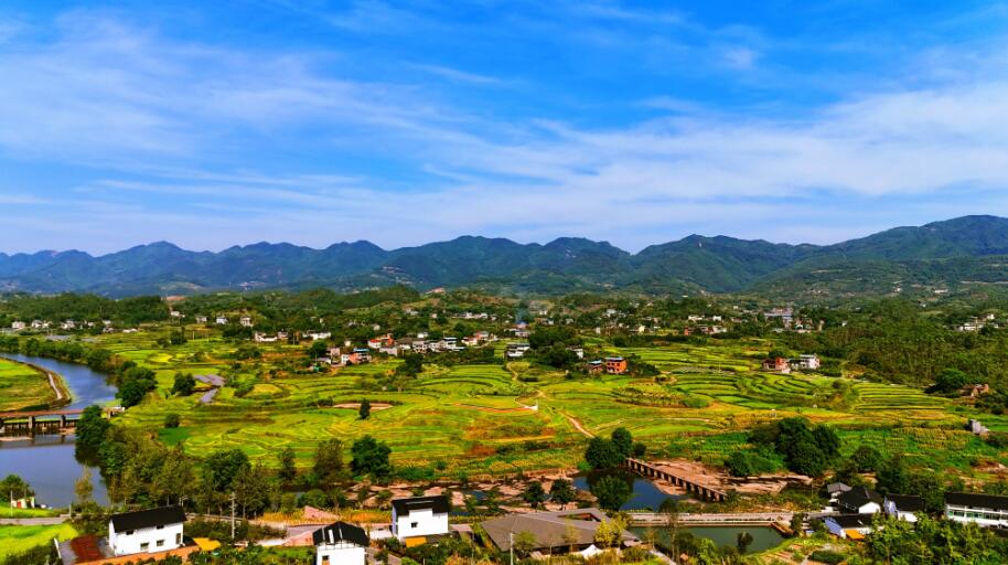 从空中鸟瞰重庆市璧山区乡村振兴项目——云雾花涧·万亩梯田一期农业核心区,层层叠叠的梯田,阡陌纵横,线条优美流畅,梯田与山间、村落、道路相映成趣,描绘出一幅独特的田野画卷。