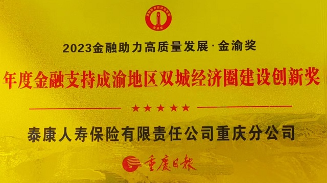 泰康人寿重庆分公司获评“年度金融支持成渝地区双城经济圈建设创新奖”及“年度金融诚信经营奖”