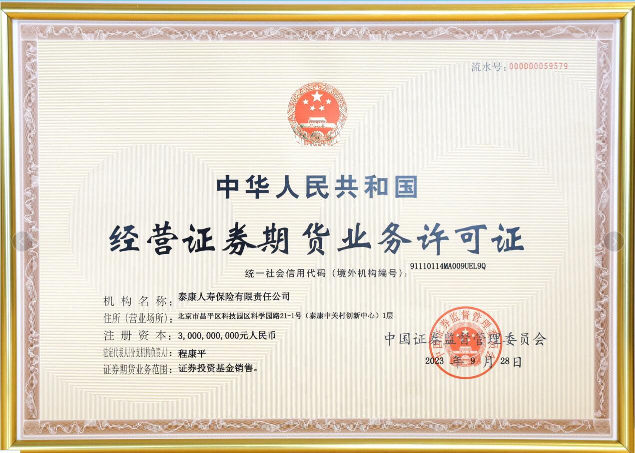 泰康人寿保险有限责任公司于2023年9月28日取得中国证券监督管理委员会核发的《经营证券期货业务许可证》。此前,泰康人寿于今年3月22日获得中国证监会北京监管局发布的行政许可,核准泰康人寿证券投资基金销售业务资格。至此,泰康人寿财富闭环布局建设再落一子,证券投资基金销售扬帆起航,为日益增长的中高净值人群及其家庭打造长寿、健康、财富的一体化服务平台。