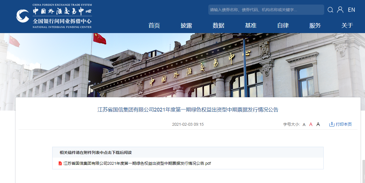 2月2日,兴业银行独立主承销的市场首单绿色权益出资型票据——“江苏省国信集团有限公司2021年度第一期绿色权益出资型中期票据”成功落地,本笔债券主体与债项评级均为AAA级,发行规模7亿元,期限三年,这是该行对发行权益投资属性中长期债务融资工具新产品的有益尝试。
