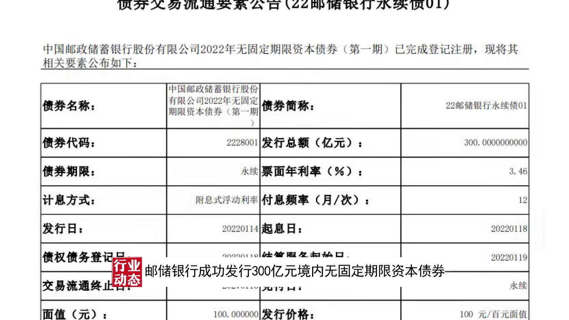 【行业动态】邮储银行成功发行300亿元境内无固定期限资本债券