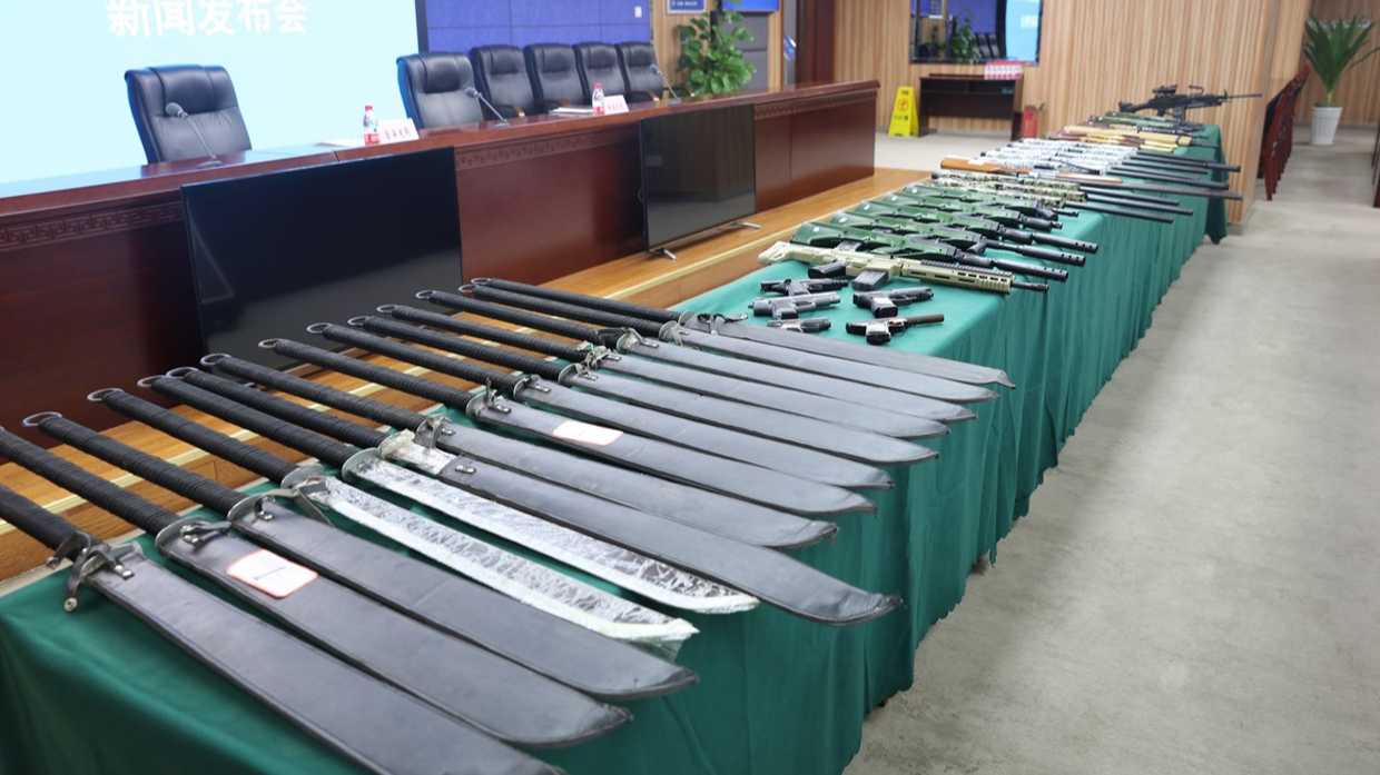 为严管严控枪爆物品,严厉打击整治枪爆违法犯罪,全力维护人民生命财产安全和治安持续稳定,今日(11日),重庆市公安局沙坪坝区分局向媒体通报了今年打击整治枪爆违法犯罪专项行动成果,现场展示缴获的非法枪支、仿真枪、管制刀具等。