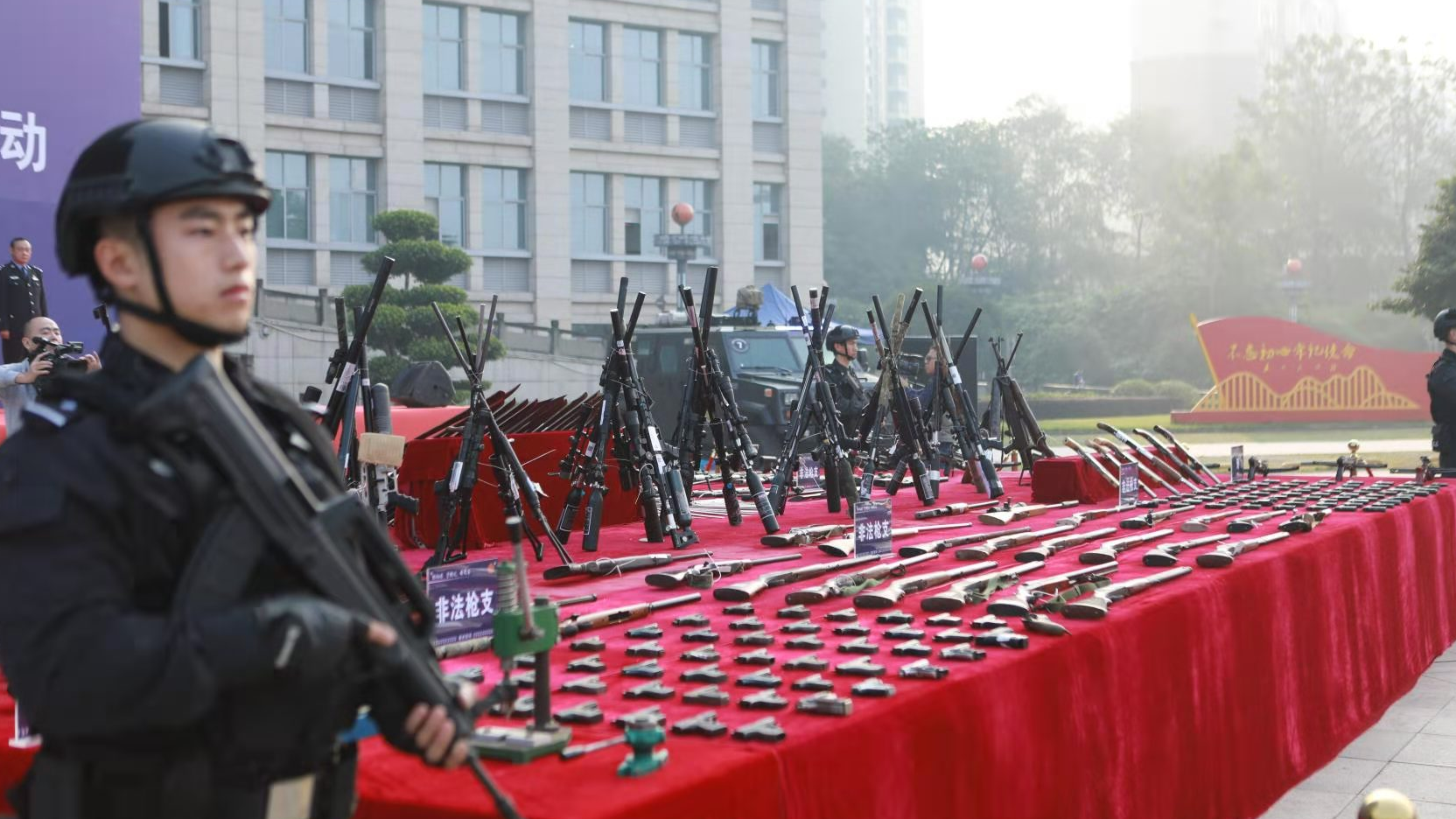 11月17日,重庆市公安局在江津区对近年收缴的1612支非法枪支、1179把管制刀具进行集中销毁。