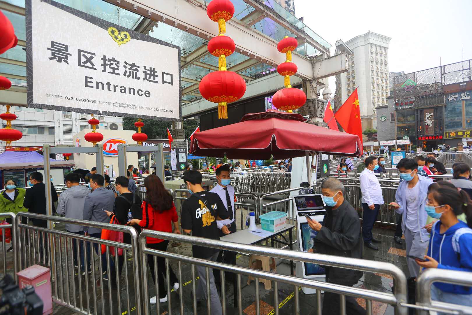 “游客朋友们大家好,请提前备好健康码和景区预约码,戴好口罩,有序排队入内!”