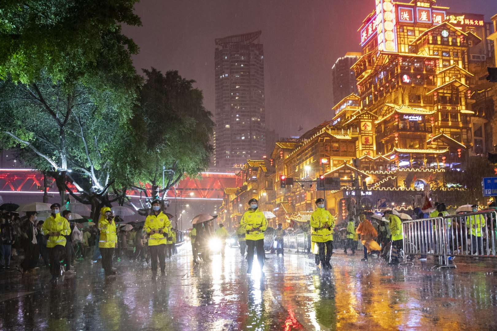 洪崖洞名场面!渝中特警筑“人墙” 开关式过马路保游客平安