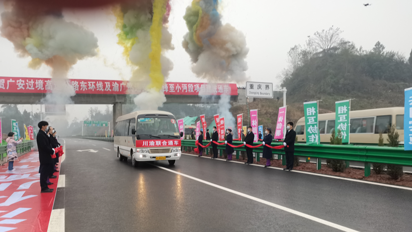 12月25日下午,广安市过境高速公路东环线及渝广高速支线前锋至小沔段高速公路正式开通,至此川渝间建成通车的高速公路通道累计达到12条,大幅提升了川渝两省市的互联互通水平,将有效助推成渝双城经济圈建设。重庆市交通局、四川省交通运输厅、合川区、广安市、华蓥市等相关部门负责人到场见证通车并慰问现场一线建设者。