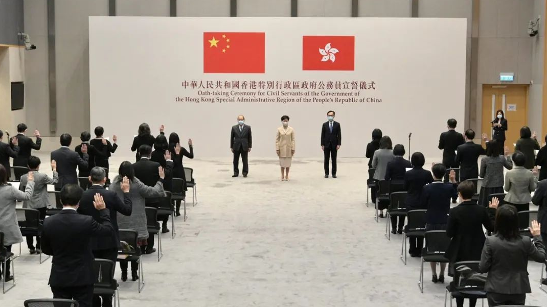 12月18日,香港特别行政区政府总部,在行政长官林郑月娥见证下,香港特区政府举行公务员宣誓仪式。参加宣誓的公务员举起右手,宣誓拥护《中华人民共和国香港特别行政区基本法》,效忠中华人民共和国香港特别行政区。