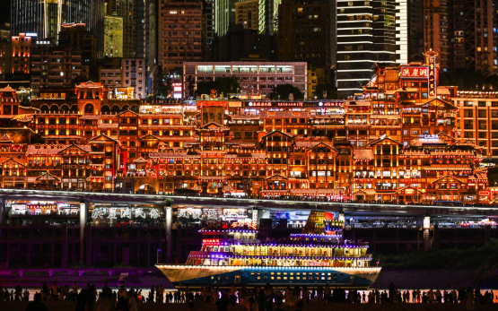 清风徐来,游轮缓缓驶过嘉陵江,层层涟漪揉碎灯火倒影;渔人湾码头高架桥下,野歌音乐会唱响“摇滚之夜”;龙门浩老街烟火气息浓郁、人声鼎沸;解放碑商圈熙熙攘攘、场面火爆……