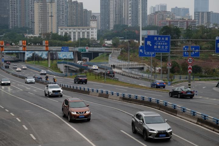 12月2日,记者驱车途经重庆市渝北区人兴路,小小的街道上已经挤满汽车。素来以烟火气闻名的山城重庆,又渐渐恢复了以往的热闹。