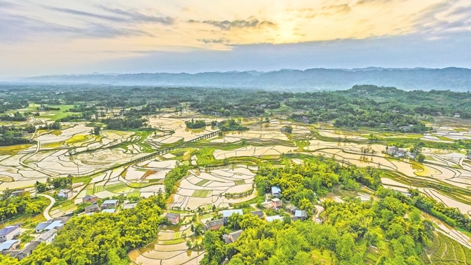 4月22日,重庆市梁平区明达镇红八村,霞光将水田染成金色,与干净整洁的村落、四通八达的公路、绿树葱茏的青山共同构成一幅美丽画卷。