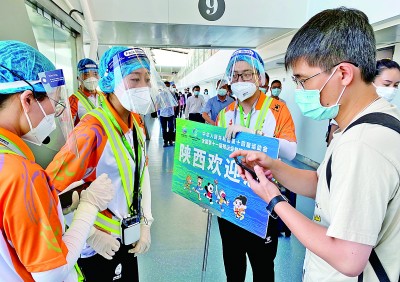 14日清晨,身着志愿者服装的大学生侯家骥,用亲切的问候迎接每一位全运村的来客;中午,迎着33摄氏度的高温,身着防护服的杨驰,严格按照操作规范为每一位驻村人员进行核酸检测;夜幕降临,西安奥体中心及其旁边高楼上灯光打出的全运会标语不停闪烁着。这一切都告诉人们——第十四届全运会来了