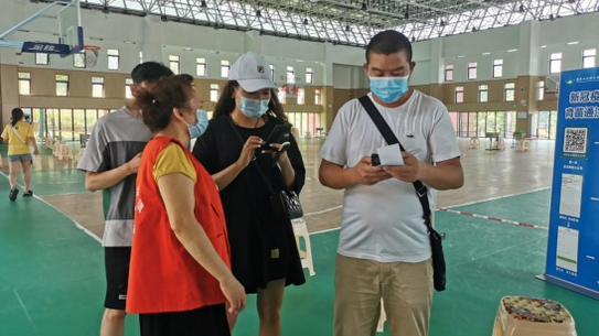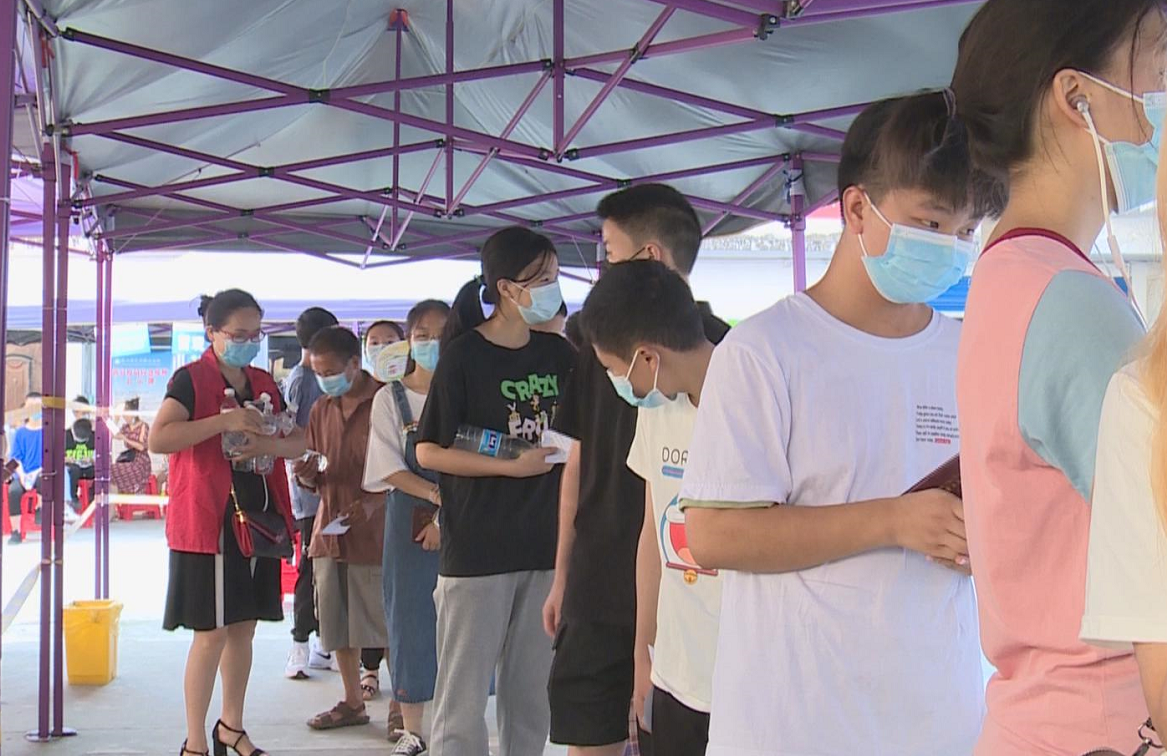 在方舱场馆,记者看到,新冠疫苗接种工作正有序进行。一群穿着红马甲、戴着红袖章的志愿者,正在引导接种人员分批有序排队进入,做好维持秩序、信息登记、提供解暑饮品等志愿服务。