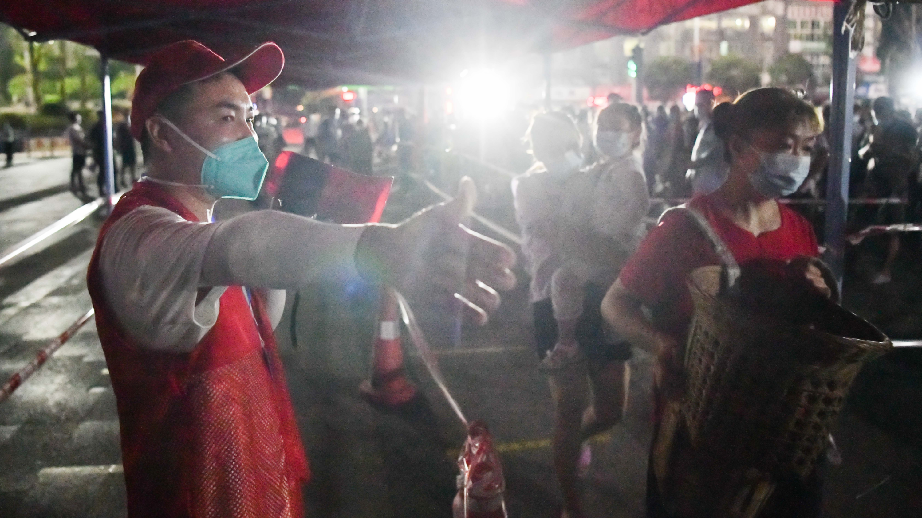 8月5日,江津双福街道,最高气温已连续三天超过40摄氏度。中午11点,双凤路社区,17岁的民间志愿者林应城头顶烈日,将一箱箱冰块运送至核酸检测点,保障冷风机能“全天候”制冷。 整个上午,他和志愿者们一共搬运了400多斤冰块,分送至4个检测点。