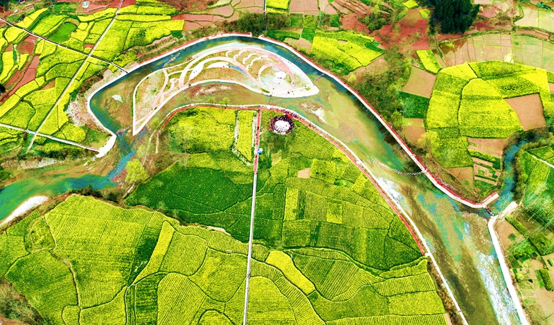 3月10日上午,在美丽金黄的油菜花盛开的酉阳自治县铜鼓镇铜西村红鱼潭湿地公园,举行了盛大的油菜花节,来自四面八方的游客,不但欣赏了美丽的油菜花,同时也欣赏了铜西村民间文化艺术团表演的特色舞蹈节目。