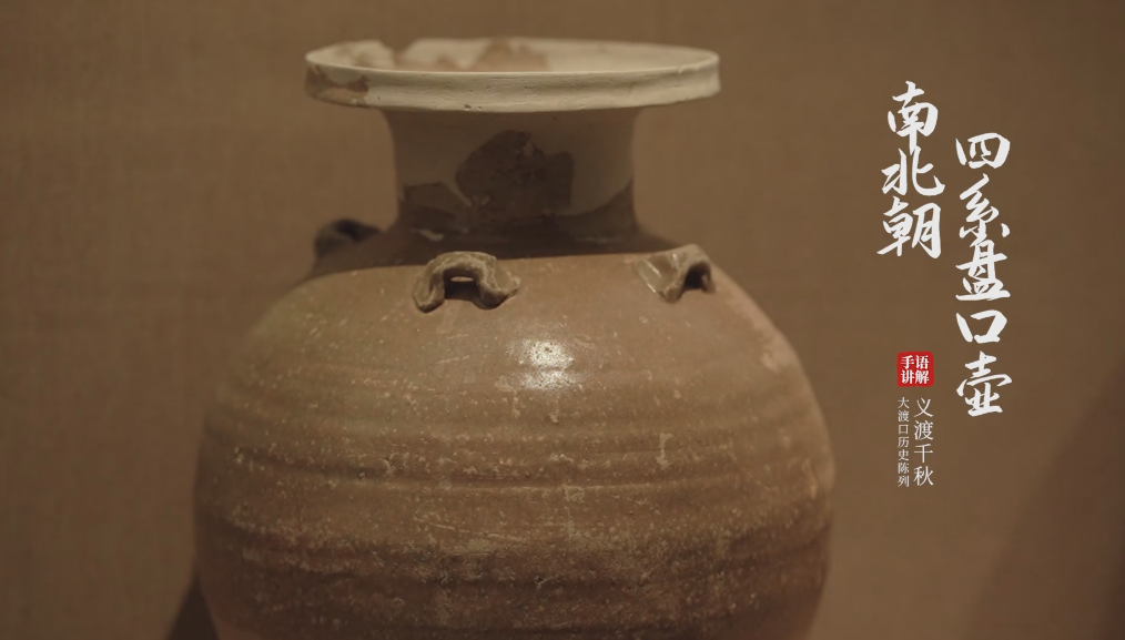南北朝四系盘口壶出土于大渡口区钓鱼嘴南北朝墓遗址。其身施青褐釉,盘口、长束颈、弧溜肩,肩部对称分布有四个桥型系,上腹圆鼓、下腹内收、平底、施釉至腹中部,釉面有细小的纹片,是唐代具有代表性的瓷器。它清雅脱俗,大气圆和,留存在四川,重庆地区都非常少见,故而非常珍贵。