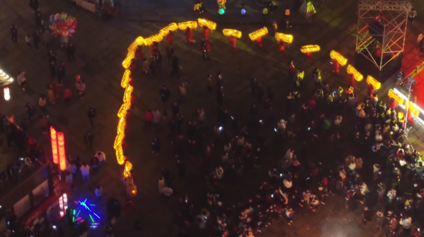 元宵节到来之际,在万州区天生城文旅街区,当地群众开展板凳龙巡游活动,为节日添彩。