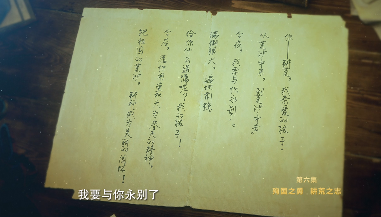 该集讲述了共产党员蓝蒂裕临刑前给儿子写下的76字诗歌《示儿》,希望他“把祖国的荒沙耕种成为美丽的园林”。而儿子蓝耕荒从此立志要报效祖国,以自己的实际行动践行父亲的遗志,成为红岩精神传承的杰出代表的故事。