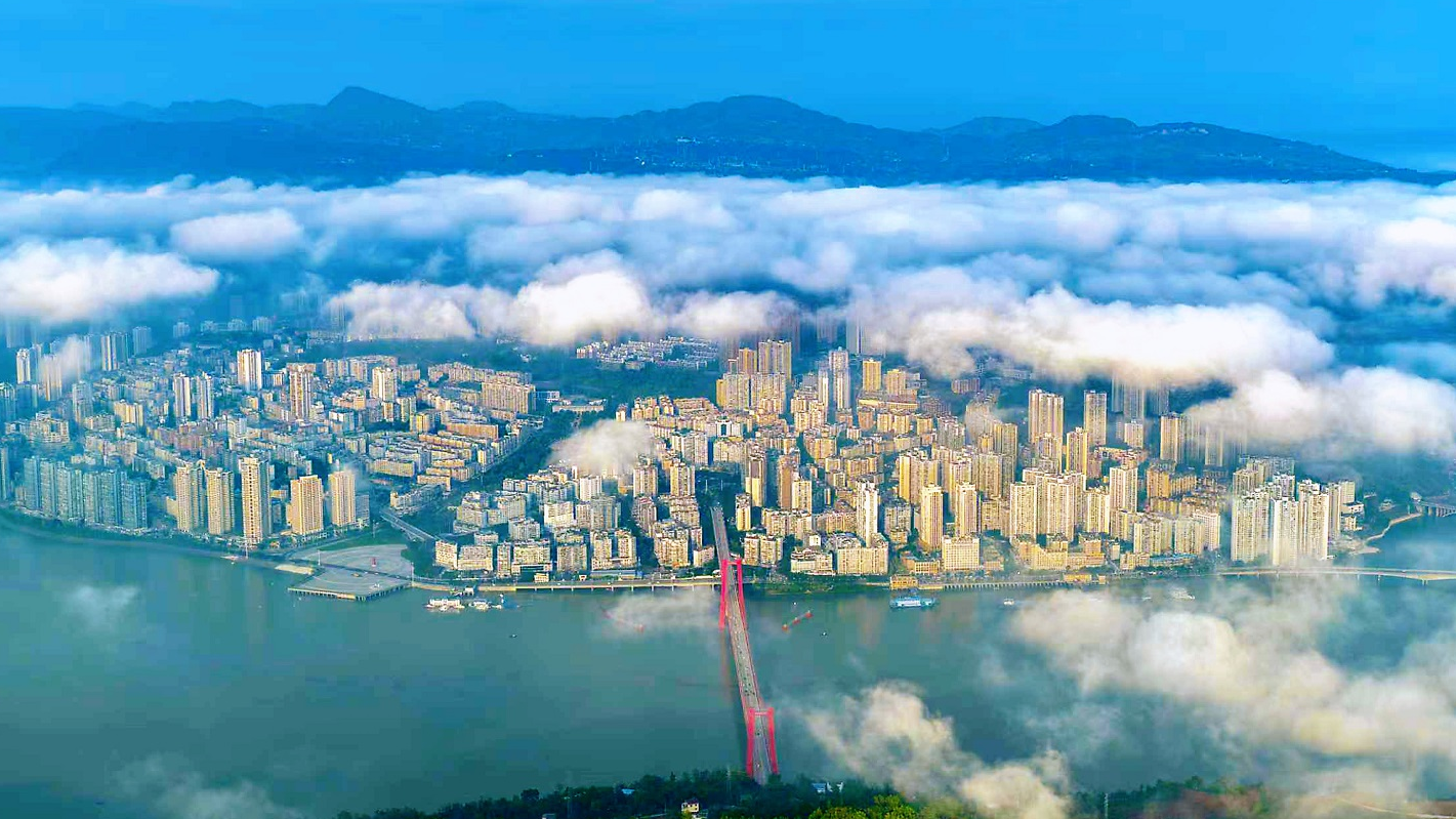 10月29日清晨,长江忠县段出现大范围流云景观,缥缈的云烟缭绕山河之间,美轮美奂,宛若仙境。从天子山上空俯瞰,绵延不断的流云仿佛给忠县县城盖上了一床厚厚的棉被。江风徐来,云雾随风游走在街区楼栋之间,好一幅美不胜收的自然画卷。
