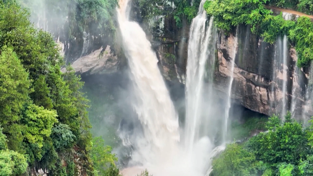 近日,一场暴雨后,万州区白土镇一面山崖处出现“百泉飞瀑”的景观,众多瀑布从悬崖边飞流而下,层层跌落,蔚为壮观。