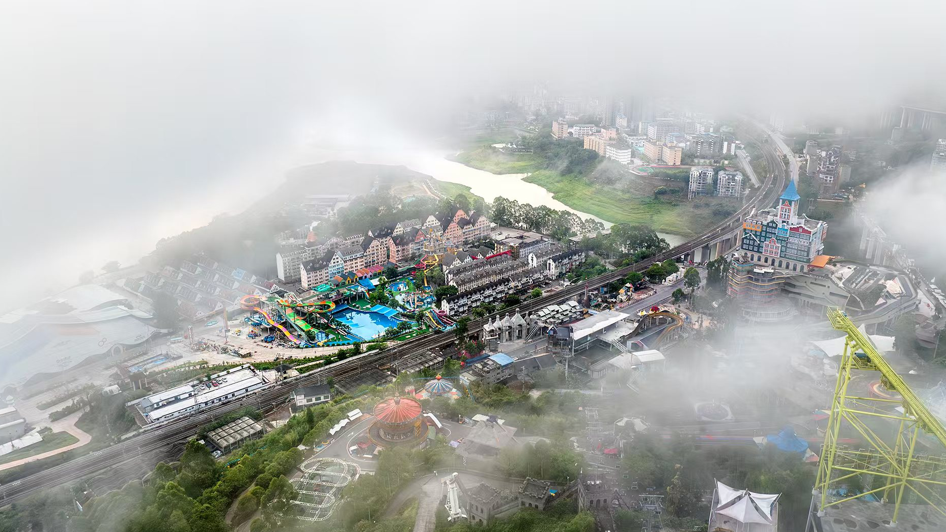 烟雨下的美心红酒小镇 清晨呈现丹青水墨山水画
