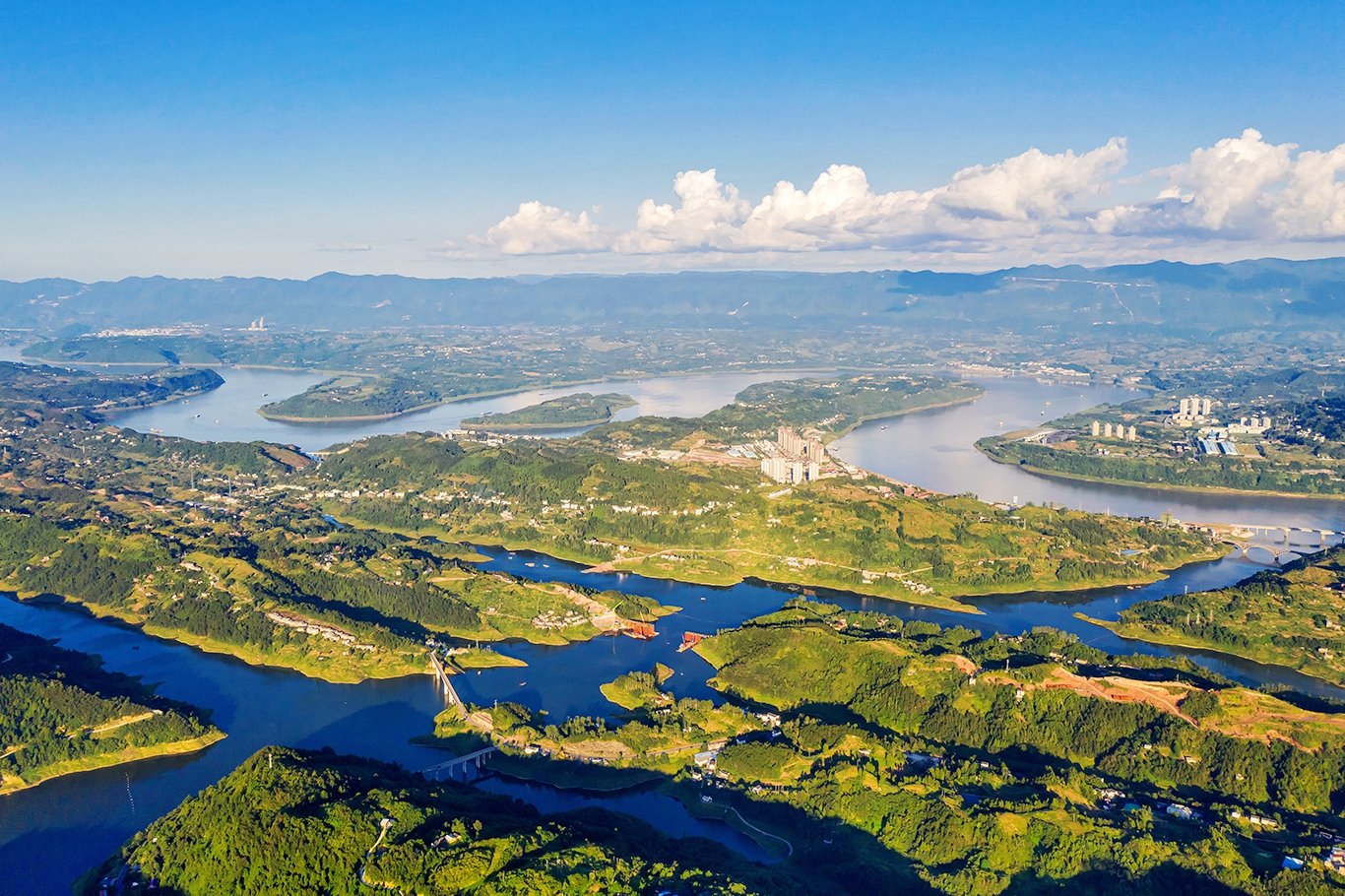 8月13日下午,在夕阳映射下,忠县皇华岛国家湿地公园色彩斑斓、桥岛相连,宛若一个五彩缤纷的千岛湖。