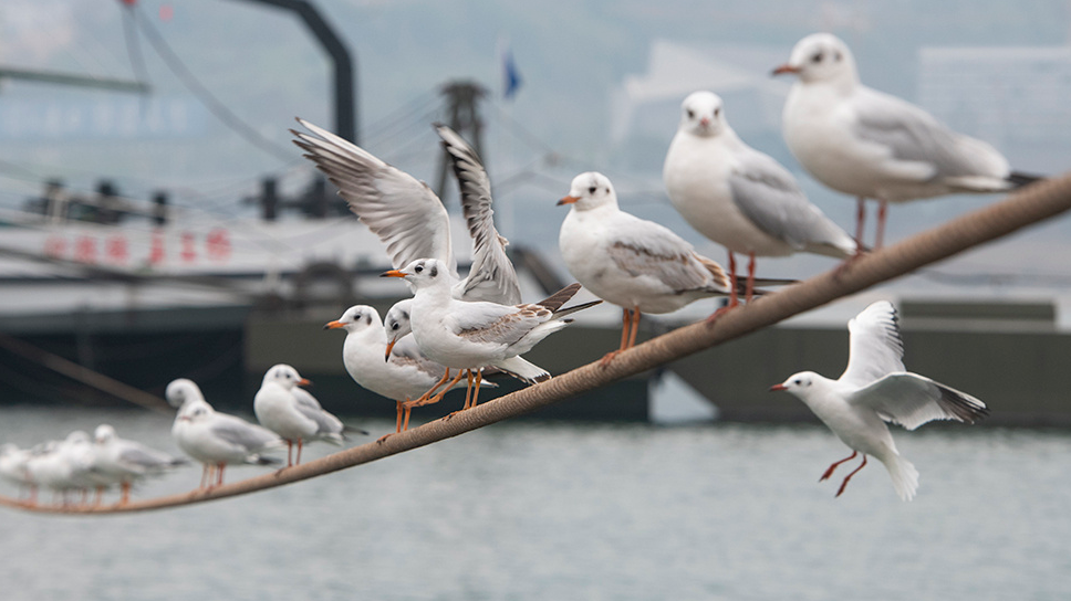 2月17日,重庆市万州区北滨公园十七码头段,数百只红嘴鸥在长江上翱翔,时而和市民互动、时而在水面畅游,叽叽喳喳欢乐热闹。城、人、鸟同框,生态和谐的画面呈现眼前。
