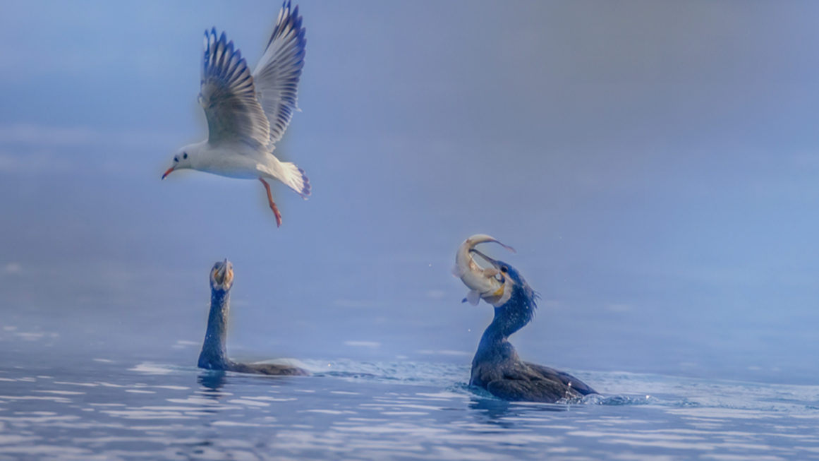 鸬鹚是大型的食鱼游禽,善于潜水,潜水后羽毛湿透,需张开双翅在阳光下晒干后才能飞翔。