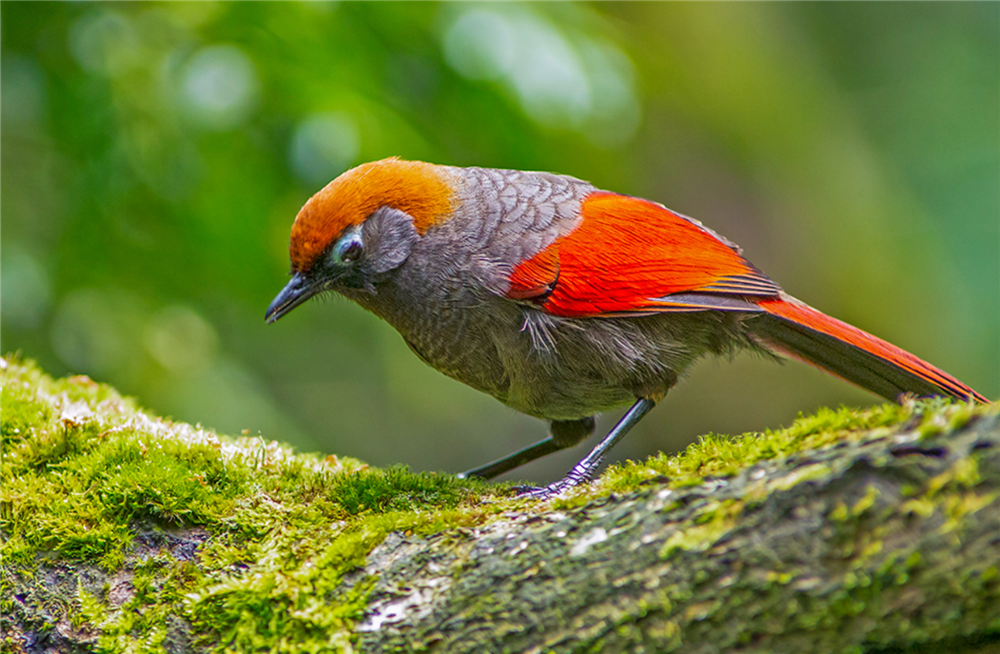 红尾噪鹛鸣唱为清脆响亮的一串高亢哨音,音调逐渐上升、节奏变快,结尾伴随着轻柔的嗤笑声。图片拍摄于重庆五里坡国家级自然保护区。