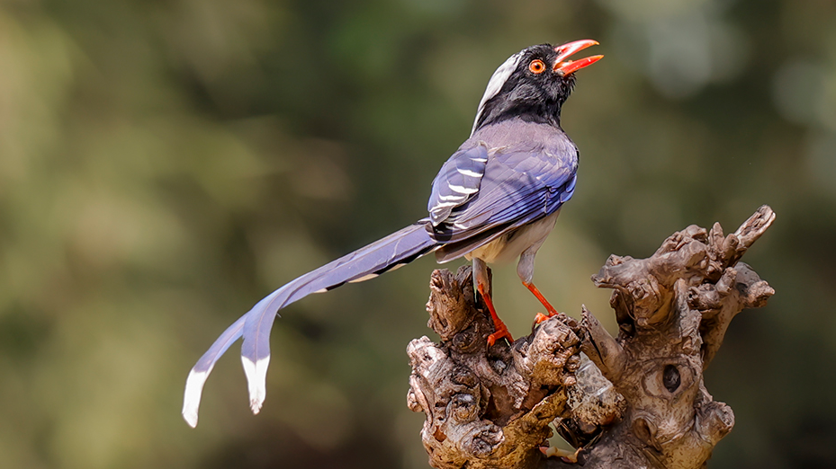 红嘴蓝鹊,属大型鸦类,体长54-65厘米。嘴、脚红色,尾长呈凸状具黑色亚端斑和白色端斑,下体白色。图片拍摄于重庆市巫山县巫峡镇柳树村。摄影:陈光国