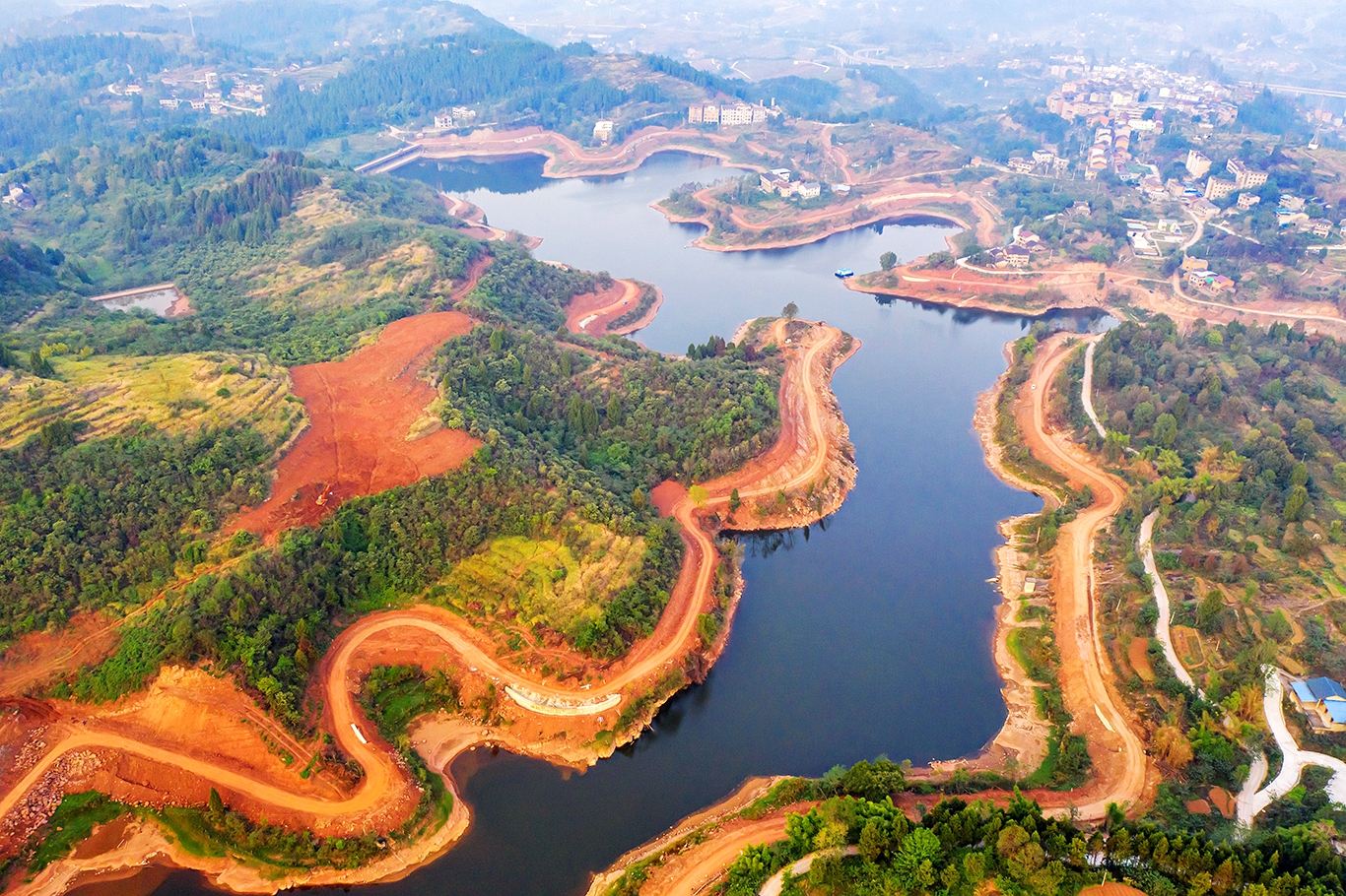10月22日,从空中俯瞰忠县磨子湖,一条蜿蜒的道路环绕湖泊,显得十分壮观。