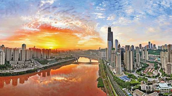 6月28日晨6时许,渝中区,朝霞把重庆天地楼群和嘉陵江水装扮得美不胜收。当日早晨,雨后的重庆中心城区空气清新,极目远望,一派生机勃勃的美丽景象。