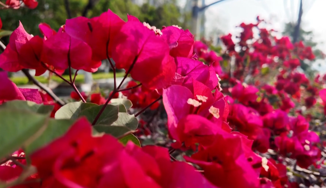 这段时间,三角梅迎来了最佳观赏期。在綦江区九曲花街,一簇簇三角梅姹紫嫣红,红色花朵缀满枝头,为市民呈现出一幅绚丽多彩的春日画卷。据了解,三角梅学名光叶子花,紫茉莉科,叶子花属,藤状灌木,花多为紫色、白色、黄色、洋红色。可修剪打造成篱墙、花球、花环、花柱、花廊等不同造型。