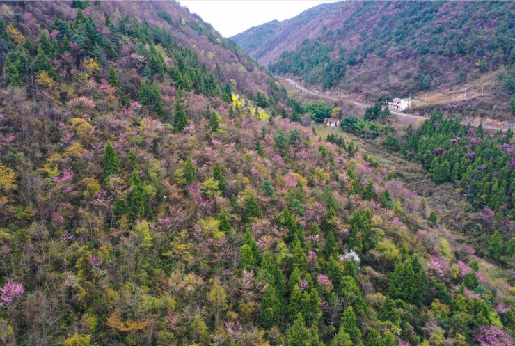 四月,随着气温的升高,在巫山县的高海拔地区,成片的野生紫荆花竞相绽放,构成一幅幅绚丽多彩的画卷,蔚为壮观。