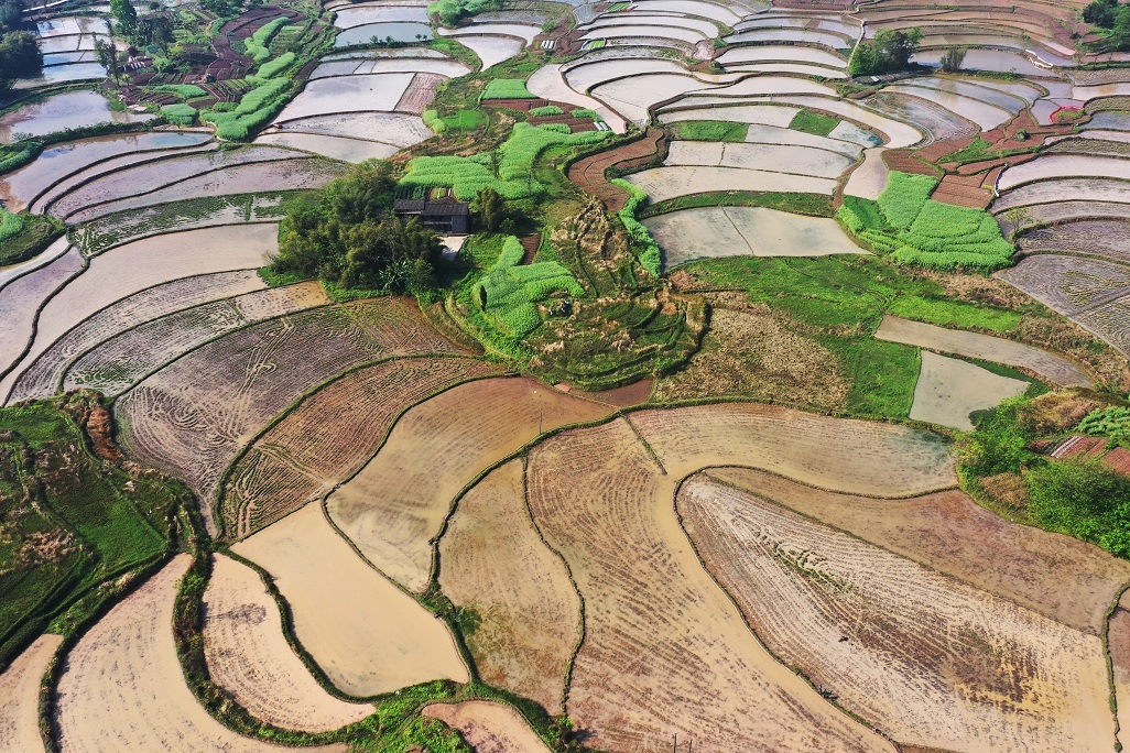 一块块梯田,层层叠加,或宽或窄,自然延伸。从天空俯瞰,仿若一幅幅工笔画勾勒在山川大地。