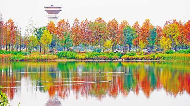 11月23日,广阳岛,几只鸳鸯在湖中游弋。初冬时节,植被丰富的广阳岛斑斓绚丽,美不胜收,成为市民热门打卡地。