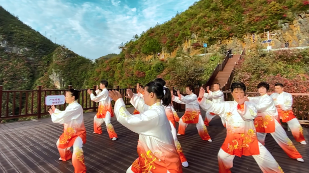 兰英大峡谷,满山红叶,一群太极拳爱好者在这里进行了集体太极拳展示。