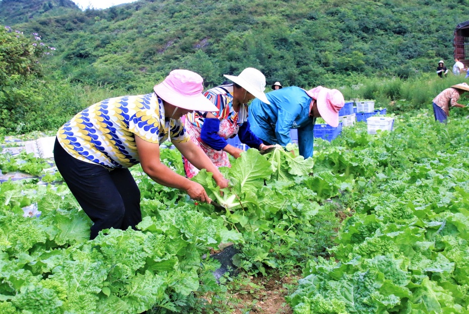 时下正是夏季蔬菜收获的季节。7月26日,在酉阳县桃花源街道天山堡村蔬菜基地,菜农们头戴草帽、手提箩筐,正在基地里采摘翠白菜。在基地旁的公路上停放着几辆运输蔬菜的大货车,刚刚采摘下来的翠白菜被装运上车,汗水顺着每个人的脸颊不停地往下淌,但大家的脸上都洋溢着丰收的喜悦。