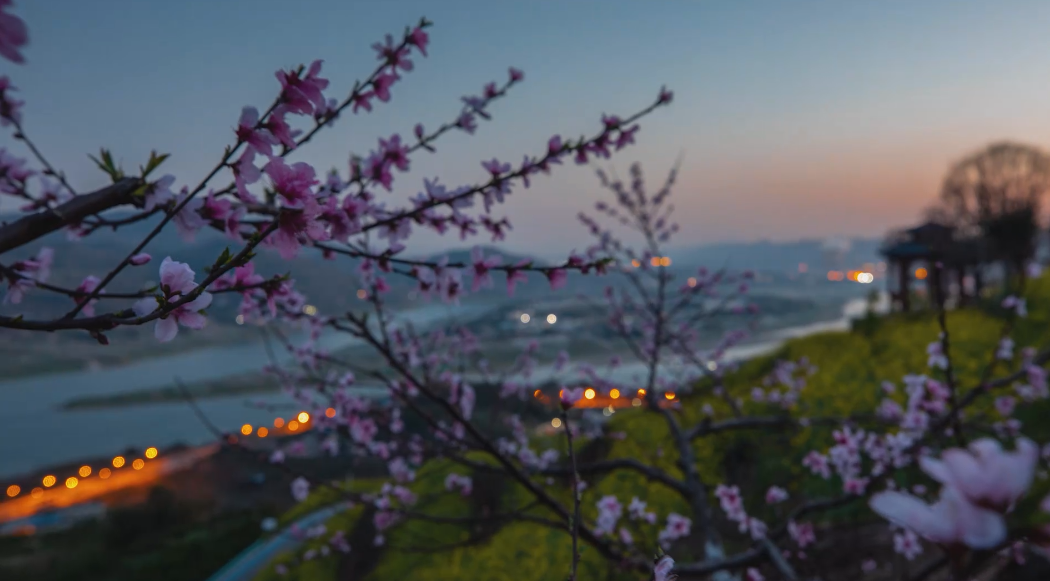 夕阳西下,夜幕将至。乡村田野间,一轮圆月从重庆市大渡口区金鳌山漫山花海中缓缓升起,晚风温柔轻抚着油菜花。城市霓虹中,车辆川流不息,公园人来人往,音乐喷泉响起,漫天水幕铺就梦幻画卷。