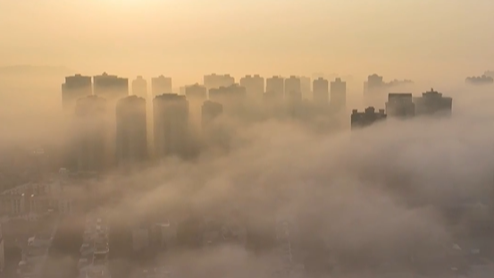 春日清晨,在重庆市大足区,天空云雾缭绕,极目远眺,白茫茫的云雾形成延绵不绝的云海,楼宇在云雾中若隐若现,呈现出一片烟波浩渺的景观。