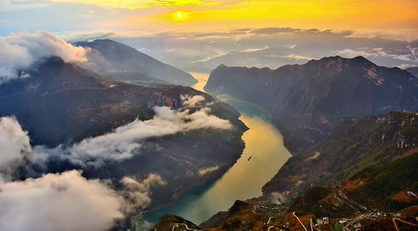 雨过天晴后的长江巫峡云雾缭绕,景色秀丽,又恰逢朝阳升起,江面波光粼粼。船行其间,霞光与山与云交相辉映,宛若进入一幅泼墨山水画卷。近年来,巫山县不断提升城市生态宜居水平,着力对长江巫峡进行河道生态治理,确保巫峡江畅、水清、岸绿、景美。