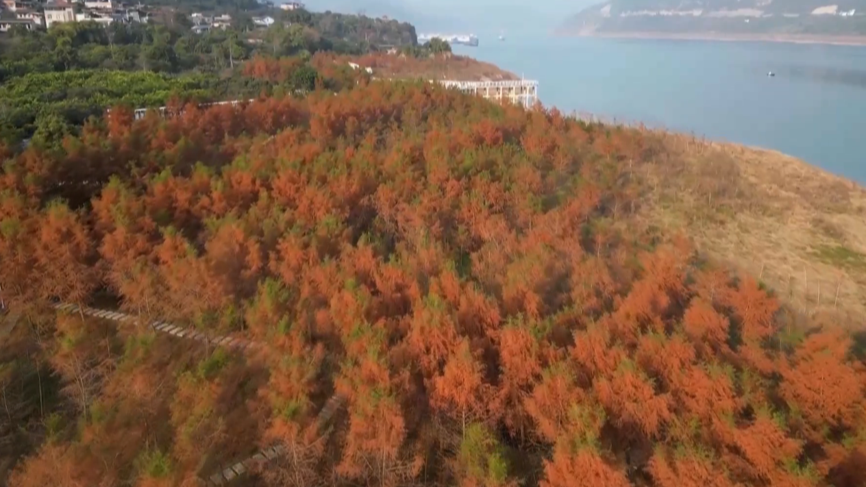 目前,在长江万州段,栽植在两岸消落带的中山杉彻底变红,呈现出“彩色森林”的美景。